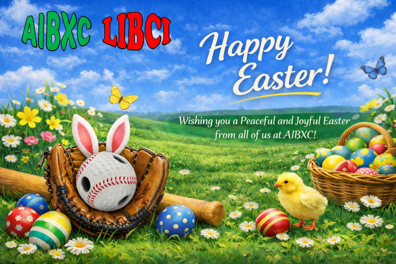 The image shows an Easter card set in a flower-filled meadow under a blue sky. At the center, a baseball glove holds a sound ball with bunny ears, with colorful eggs nearby. At the top, the words “AIBXC” and “LIBCI”, and in the middle the message “Happy Easter! Wishing you a Peaceful and Joyful Easter from all of us at AIBXC!”.