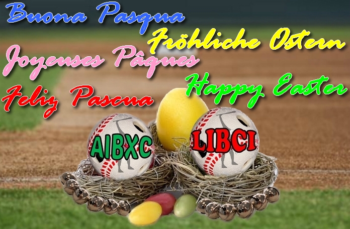 Nella cartolina pasquale in allegato troverete in primo piano due nidi (contornati da ovetti e nostri sonagli) contenenti ciascuno le nostre palline con i loghi AIBXC e LIBCI. Dietro un terzo nido contenente un uovo di colore giallo. Lo sfondo è costituito dalla foto della corsia di terra rossa del diamante di un campo da baseball nella quale si intravede in lontananza il cuscino di seconda base. Gli auguri in diverse lingue completano il tutto.