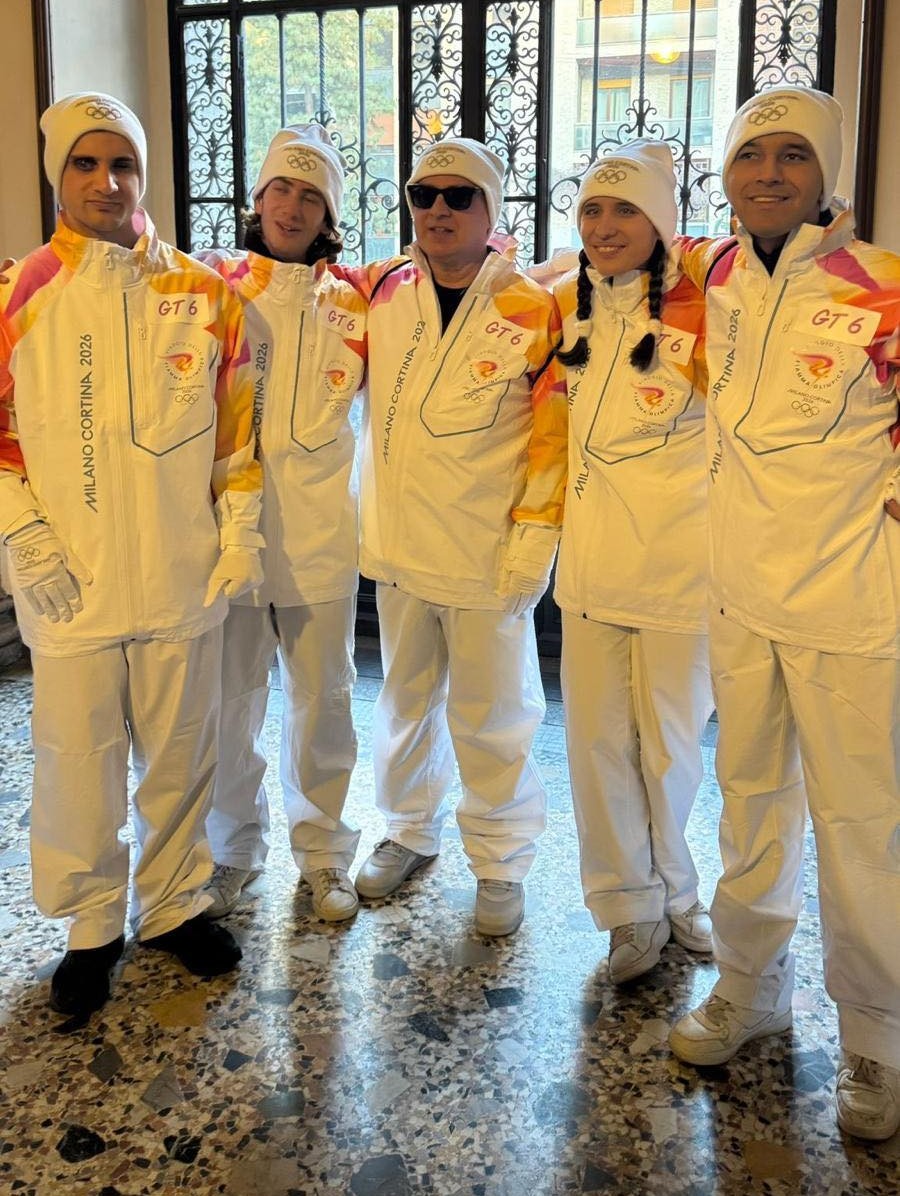 Nell’immagine sopra da sinistra Gabriele Nesossi, Fabio Trombini, Francesco Cusati, Alessandra Penna e Juan Girelli, tedofori durante il percorso della Fiaccola Olimpica a Milano.