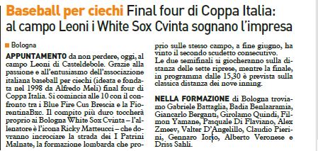 APPUNTAMENTO da non perdere, oggi, al campo Leoni di Casteldebole. Grazie alla passione e all'entusiasmo dell'AIBXC (ideata e fondata nel 1998 da Alfredo Meli) final four di Coppa Italia. Si comincia alle 10 con il confronto tra i BlueFire Cus Brescia e la Fiorentina BXC. Il compito più duro toccherà proprio ai Bologna White Sox Cvinta - l'allenatore è l'icona Ricky Matteucci - che dovranno incrociare la strada de I Patrini Malnate, la formazione lombarda che proprio nello stesso campo, a fine giugno, ha vinto il secondo scudetto consecutivo. Le due semifinali si giocheranno sulla distanza delle sette riprese, mentre la finale, in programma dalle 15,30, è prevista sulla classica distanza dei nove inning.
