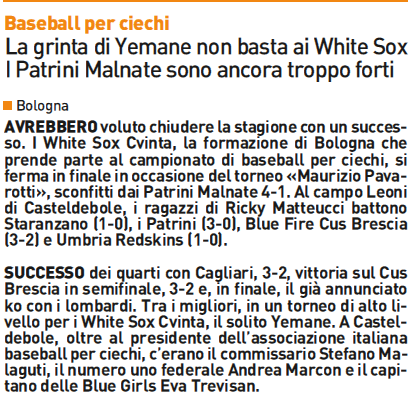 Bologna. AVREBBERO voluto chiudere la stagione con un successo. I White Sox Cvinta, la formazione di Bologna che prende parte al campionato di baseball per ciechi, si ferma in finale in occasione del torneo "Maurizio Pavarotti", sconfitti dai Patrini Malnate 4-1. Al campo Leoni di Casteldebole, i ragazzi di Ricky Matteucci battono Staranzano (1-0), I Patrini (3-0), Blue Fire Cus Brescia (3-2) e Umbria Redskins (1-0).