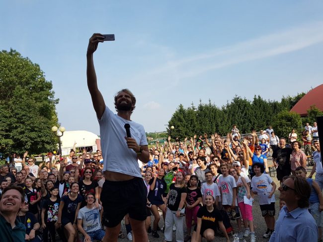 Nella immagine di copertina il campione olimpico di nuoto Massimiliano Rosolino che si scatta un selfie con tutta la gente dietro.