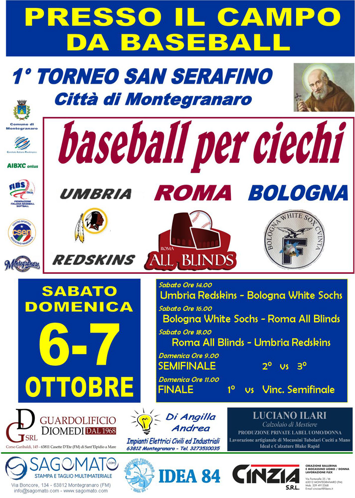 Il prossimo weekend (6-7 ottobre) si svolgerà presso il campo da baseball di Montegranaro il 1° Torneo San Serafino Città di Montegranaro con la partecipazione delle squadre degli Umbria Redskins, Roma AllBlinds e Bologna White Sox.