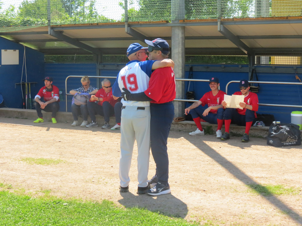 Nell'immagine di copertina bella foto che ritrae il coach dei Tigers Eugenio Brivio mentre abbraccia il giocatore de I Patrini Malnate Gaetano Marchetto.