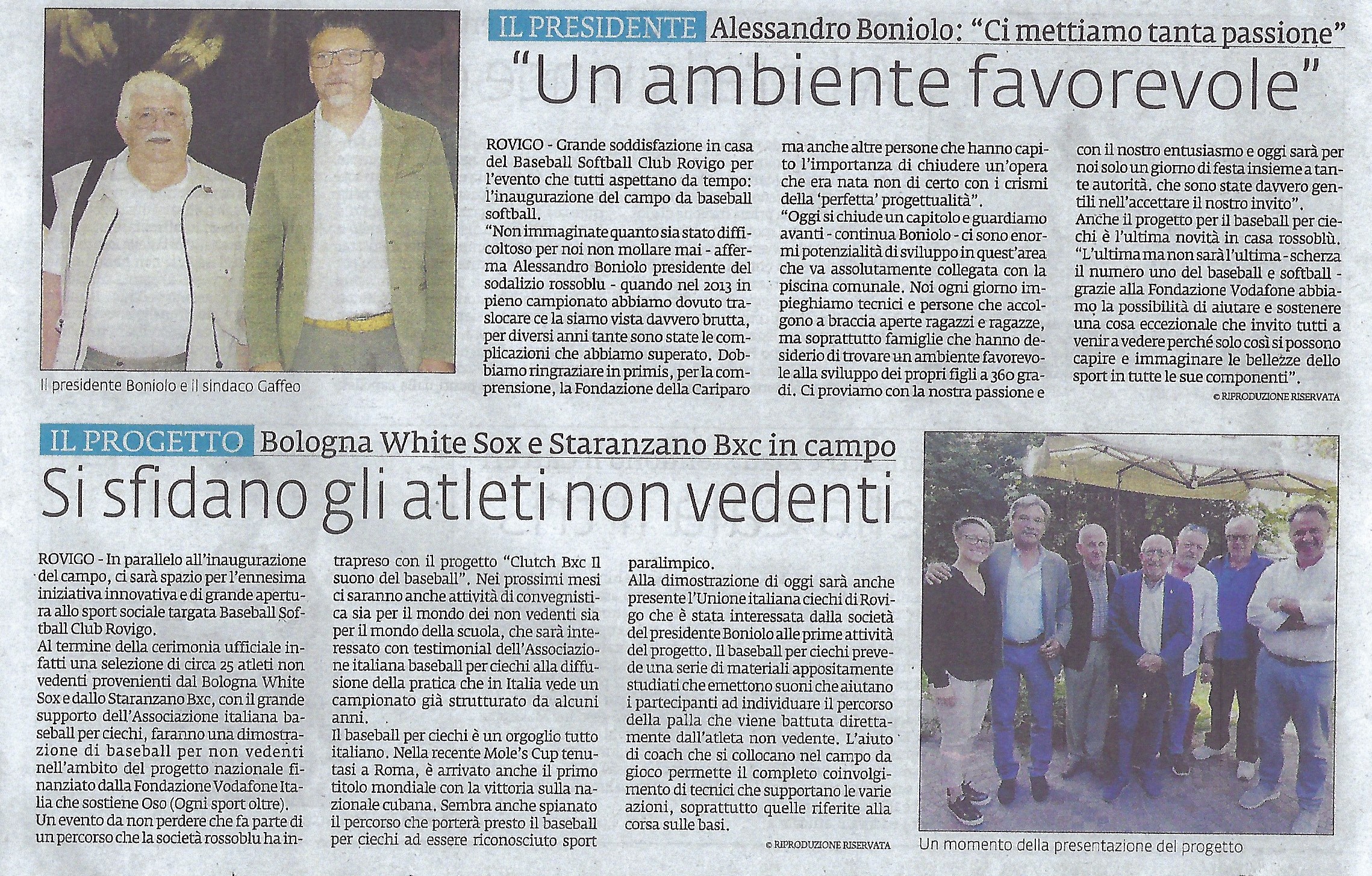 Alla dimostrazione oggi sarà anche presente l’Unione italiana ciechi di Rovigo che è stata interessata dalla società del presidente Boniolo alle prime attività del progetto. Il baseball per ciechi prevede una serie di materiali appositamente studiati che emettono suoni che aiutano i partecipanti ad individuare il percorso della palla che viene battuta direttamente dall’atleta non vedente. L’aiuto di coach che si collocano nel campo da gioco permette il completo coinvolgimento di tecnici che supportano le varie azioni, soprattutto quelle riferite alla corsa sulle basi.
