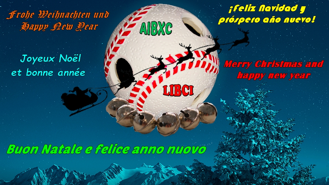 THIS IS OUR GREETINGS CARD IN WHICH THERE IS A SNOWY MOUNTAIN SCENERY WITH IN THE CENTRE OUR GIANT SOUND BALL UNDER SHAPE OF THE MOON, AT THE BOTTOM OF WHICH THERE ARE 6 BELLS. ON THE OUTSIDE OF THE BALL THERE ARE THE AIBXC WRITING, AT THE TOP, AND THE LIBCI WRITING, AT THE BOTTOM. MOREOVER THE BALL IS CROSSED BY SANTA CLAUS ON THE SLEIGH PULLED BY 5 REINDEER (DEPICTED IN BLACK).
