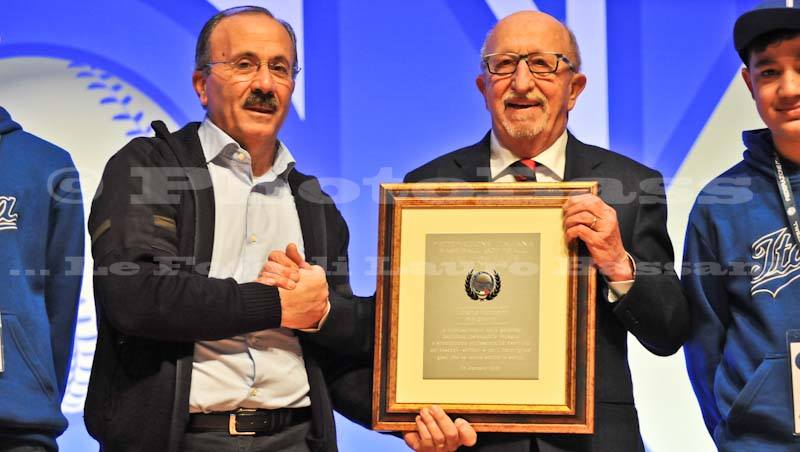 E’ stato poi il momento del presidente Alberto Mazzanti che è stato premiato, nella sala dell’anfiteatro, dal consigliere federale Luigi Cerchio per l’ingresso nella Hall of Fame, riconoscimento meritato per una vita dedicata al nostro sport: prima con il baseball normodotati, poi con il baseball per non vedenti del quale è uno dei fondatori.
