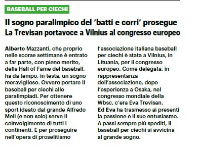 Alberto Mazzanti, che proprio nelle scorse settimane è entrato a far parte, con pieno merito, della Hall of Fame del baseball, ha da tempo, in testa, un sogno meraviglioso. Ovvero portare il baseball per ciechi alle paralimpiadi. Per ottenere questo riconoscimento di uno sport ideato dal grande Alfredo Meli (e non solo) serve il coinvolgimento di tutti i continenti. E per proseguire nell’opera di proselitismo l’associazione italiana baseball per ciechi è stata a Vilnius, in Lituania, per il congresso europeo. Come delegata, in rappresentanza dell’associazione, dopo l’esperienza a Osaka, nel congresso mondiale della Wbsc, c’era Eva Trevisan. Ed Eva ha trasmesso ai presenti la passione e il suo entusiasmo. A passi sempre più spediti, il baseball per ciechi si avvicina al grande sogno.