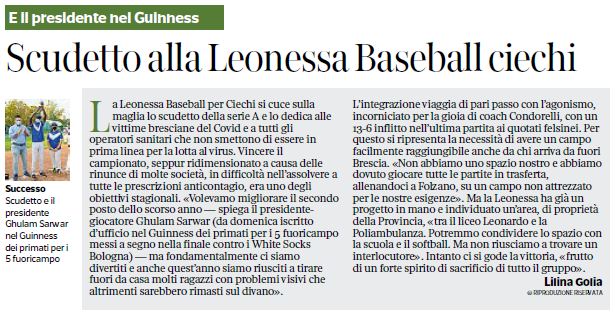 rinunce di molte società, in difficoltà nell’assolvere a tutte le prescrizioni anticontagio, era uno degli obiettivi stagionali. «Volevamo migliorare il secondo posto dello scorso anno—spiega il presidentegiocatore Ghulam Sarwar (da domenica iscritto d’ufficio nel Guinness dei primati per i 5 fuoricampo messi a segno nella finale contro i White Socks Bologna)—ma fondamentalmente ci siamo divertiti e anche quest’anno siamo riusciti a tirare fuori da casa molti ragazzi con problemi visivi che altrimenti sarebbero rimasti sul divano».