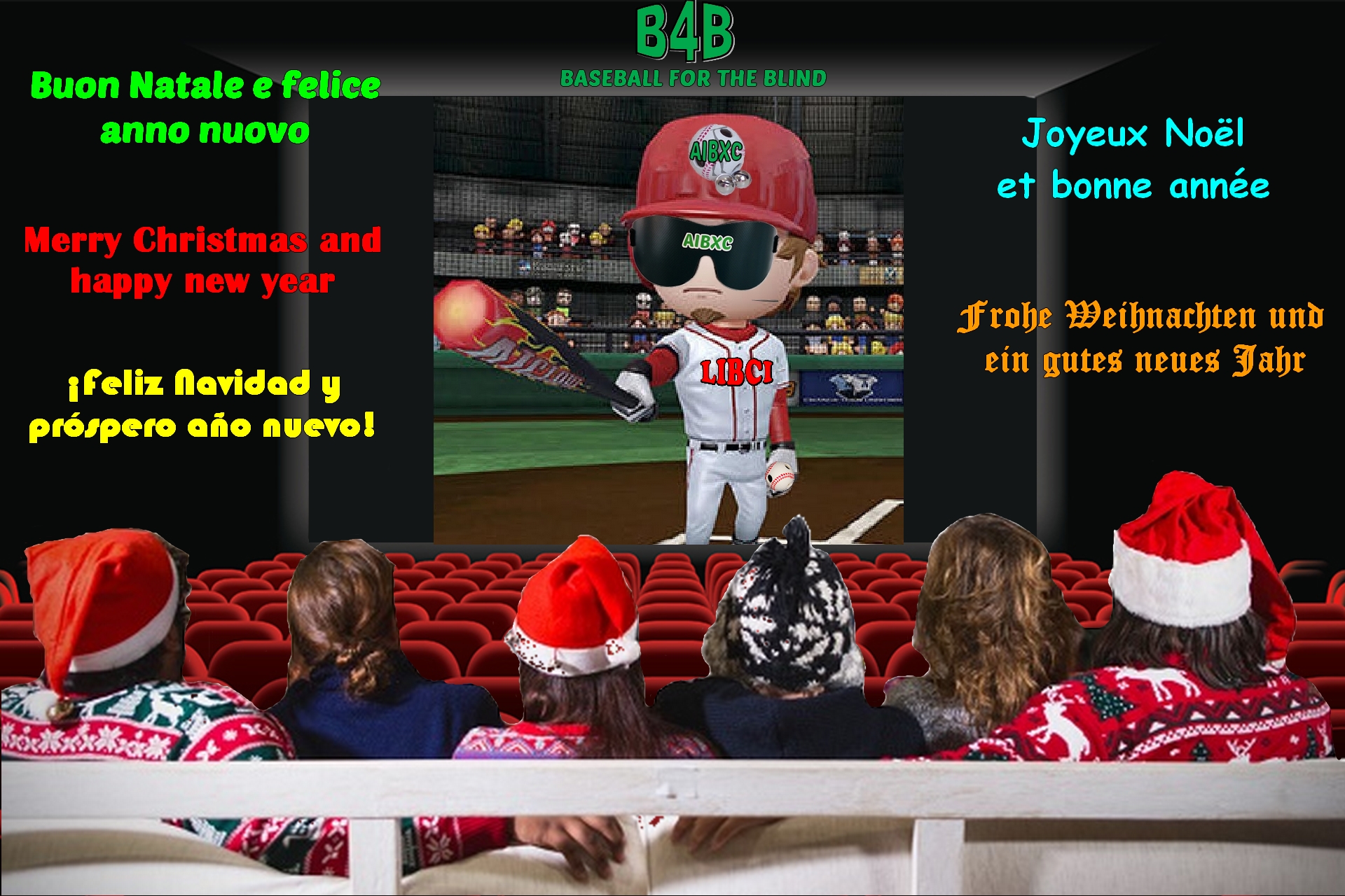 OUR GREETING CARD IS SET IN AN EMPTY MOVIE THEATER WHERE A BASEBALL FOR THE BLIND VIDEO (CARTOON) IS BEING PROJECTED. A FAMILY OF SIX PEOPLE WEARING CHRISTMAS HATS AND JUMPERS SIT IN THE BACK ROW. YOU CAN SEE THE MOVIE TITLE IN GREEN “B4B BASEBALL FOR THE BLIND” ON THE TOP OF THE SCREEN. BELOW IS A LEFT-HANDED BATTER WEARING A WHITE UNIFORM WITH THE RED “LIBCI” INSIGNIA ON HIS CHEST, A RED HAT WITH THE “AIBXC” LOGO AND A BLACK MASK WITH THE GREEN “AIBXC” INTIALS. THE BATTER, READY IN THE BATTER’S BOX, IS POINTING THE BLACK AND RED BAT, HELD IN THE RIGHT HAND, TOWARDS SECOND BASE FOR ORIENTATION, WHILE IN THE LEFT HAND YOU CAN SEE THE BALL WITH BELLS INSIDE. BEHIND HIM IN THE BACKGROUND, IS THE CROWD AT THE STADIUM. THE WHOLE IMAGE IS COMPLETED BY COLORED MESSAGES OF GREETINGS IN DIFFERENT LANGUAGES THAT ARE PLACED SIDE BY SIDE ON THE SCREEN.