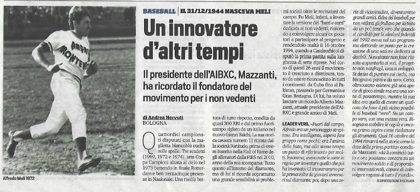 Quattordici campionati disputati con la maglietta biancoblù cucita sulle spalle. Tre scudetti (1969, 1972 e 1974), una Coppa Campioni alzata al cielo nel 1973 battendo in finale Rotterdam e ben trentacinque presenza in Nazionale. Una media battuta di tutto rispetto, condita da quasi 300 RBI e dal primo fuoricampo siglato da un italiano nel nuovo Gianni Falchi. La sua storica casacca numero 11 ritirata dalla società Fortitudo, prima di essere inserito nella Hall of Fame degli allenatori dalla FIBS nel 2010, anno della sua scomparsa. Tutto questo all’interno del diamante, ma di lui si ricorda soprattutto una grande sensibilità ai problemi sociali oltre le recinzioni del campo. Fu Meli, infatti, a inventare la versione del “batti e corri” dedicata ai non vedenti, riuscendo a coinvolgere alcuni ex giocatori a partecipare al progetto e rendendolo realtà il 16 ottobre 1994, quando a Casalecchio si disputò la prima partita sulla lunghezza di sette riprese. Nel corso di questi 26 anni il movimento è cresciuto a dismisura, tanto da essere riconosciuto in tutti i continenti: da Cuba fino al Pakistan, passando per Germania e Gran Bretagna. Di lui, ha voluto lasciare un ricordo Alberto Mazzanti, attuale presidente dell’AIBXC e grande amico di Meli.