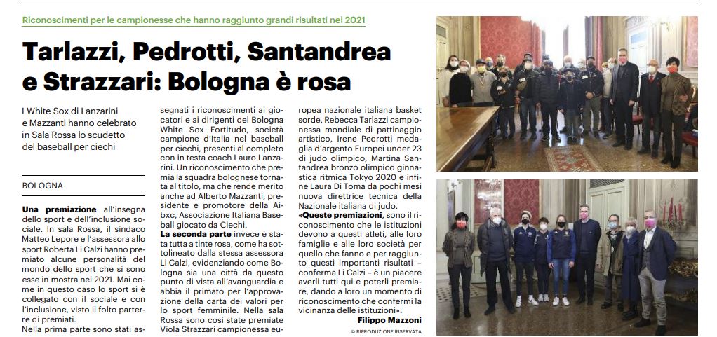 Mai come in questo caso lo sport si è collegato con il sociale e con l’inclusione, visto il folto parterre di premiati. Nella prima parte sono stati assegnati i riconoscimenti ai giocatori e ai dirigenti del Bologna White Sox Fortitudo, società campione d’Italia nel baseball per ciechi, presenti al completo con in testa coach Lauro Lanzarini. Un riconoscimento che premia la squadra bolognese tornata al titolo, ma che rende merito anche ad Alberto Mazzanti, presidente e promotore della Aibxc, Associazione Italiana Baseball giocato da Ciechi.
