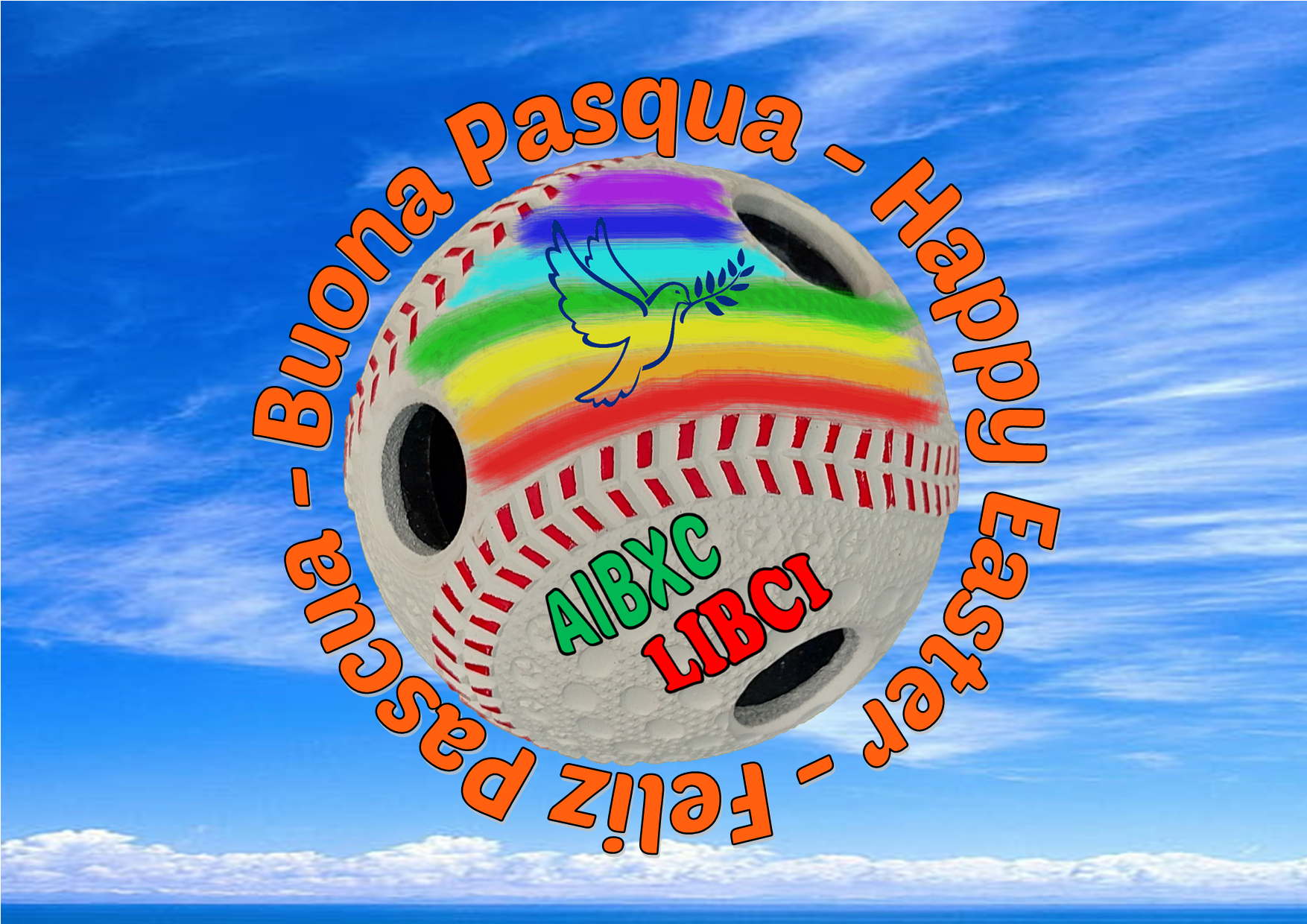 Nella cartolina di auguri vi è una palla sonora arcobaleno a simboleggiare la bandiera della PACE con una colomba stilizzata sopra. La palla è contornata dalla scritta “Buona Pasqua” in varie lingue sullo sfondo di un limpido cielo blu. I loghi AIBXC e LIBCI in basso.